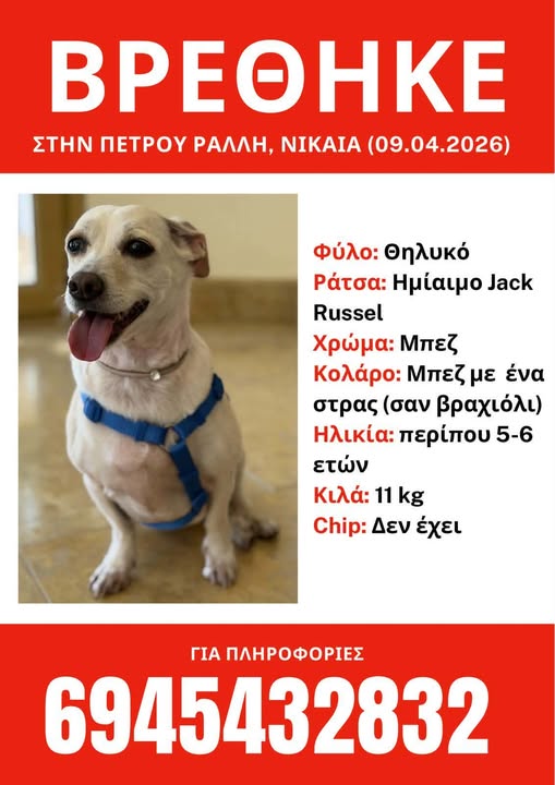 Βρέθηκε στην Πέτρου Ράλλη στην Νίκαια. Το αναζητά κανείς; Φύλο: Θηλυκό Ράτσα: Ημίαιμο Jack Russel Χρώμα: Μπεζ Κολάρο: Μπεζ με ένα στρας (σαν βραχιόλι Ηλικία: περίπου 5-6 ετών Κιλά: 11 kg Chip: Δεν έχει